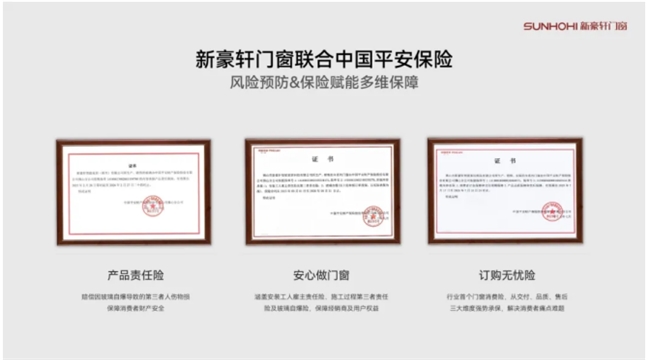 为守护广大消费者安心筑家,新豪轩门窗联合中国平安,先后推出「产品责任险」「安心做门窗」「订购无忧险」三大保障,构建全面规范的防护体系。其中,「订购无忧险」作为行业内首个门窗消费险,从交付履约、品质保障、售后响应三大维度强化承保,精准解决消费者核心痛点,升级选购体验。