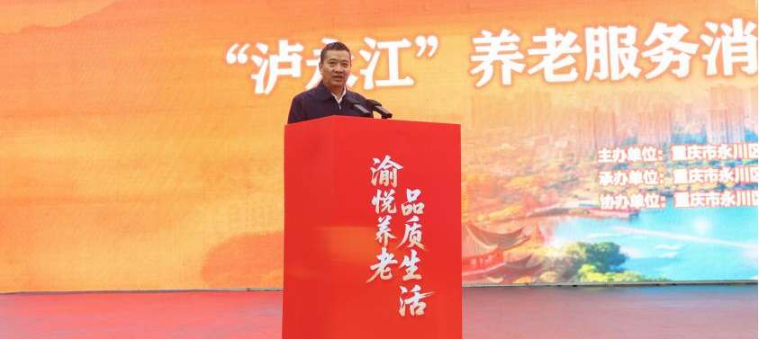 永川区委常委、副区长宋文致欢迎词。他对三地领导、嘉宾及群众的到来表示热烈欢迎,他强调,本次活动是携手泸州、江津融入成渝地区双城经济圈、推动服务惠民的具体实践,将让群众直观感受现代养老服务的品质与温度,助力更多老年人享受优质便捷服务。